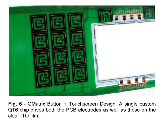 圖6:QMatrix 按鍵和觸摸屏的一體式設(shè)計(jì),利用一片 QT6 單芯片同時(shí)驅(qū)動(dòng) PCB 電極以及 ITO 薄膜上的鍵盤。