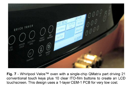 圖7:Whirlpool Velos 微波爐采用單芯片 QMatrix 來(lái)驅(qū)動(dòng) 21 個(gè)傳統(tǒng)的觸摸按鍵,以及構(gòu)成 LCD 觸摸屏的 10 個(gè)透明式 ITO 薄膜式按鍵。該設(shè)計(jì)采用了單層 CEM-1 PCB,成本很低。