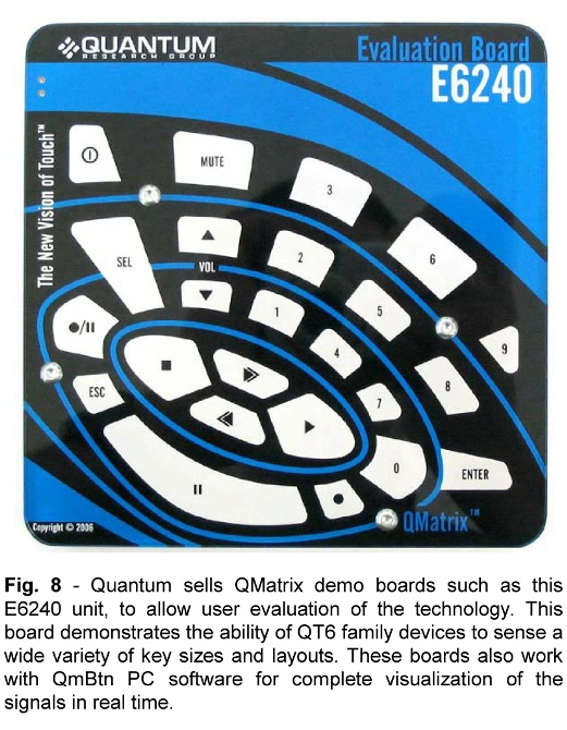 圖8 :量研科技銷售 QMatrix 演示版如 E6240,為用戶提供該技術(shù)的評(píng)測(cè)手段。該評(píng)測(cè)板可以支持各種按鍵尺寸和布局,演示 QT6 系列器件的強(qiáng)大功能。QMatrix 演示版還可配合 QmBtn 軟件使用,以進(jìn)行按鍵實(shí)時(shí)信號(hào)的全景視象化觀測(cè)。