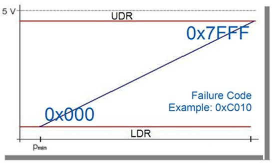 模擬輸出只允許進(jìn)行信號范圍內(nèi)(如10-90%)的傳感器信號傳輸,并通過開關(guān)將低診斷范圍(LDR)和高診斷范圍(UDR)轉(zhuǎn)換為故障狀態(tài)。因此,其無法傳送更詳細(xì)的故障信息。