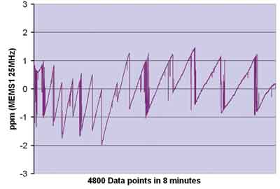 ●MEMS器件顯示了每百萬分之幾的階躍變化。這是校正諧振器溫度變化的溫度補(bǔ)償電路的特性。該特性可列成PLL電路中的數(shù)字變化表從而校正頻率。
