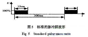 電磁兼容設(shè)計(jì)靠電磁兼容試驗(yàn)來(lái)驗(yàn)證與改進(jìn)?,F(xiàn)在,有了比較完善的電磁兼容試驗(yàn)方法和專門(mén)的試驗(yàn)設(shè)備。開(kāi)關(guān)電器動(dòng)作時(shí),形成強(qiáng)烈的干擾,產(chǎn)生瞬態(tài)脈沖。IEC61000-4-4標(biāo)準(zhǔn)對(duì)電快速瞬變脈沖干擾作出規(guī)定,分為單個(gè)脈沖、一群脈沖、脈沖群。脈沖群波形如圖5所示,周期為300ms,脈沖束寬度為15ms。