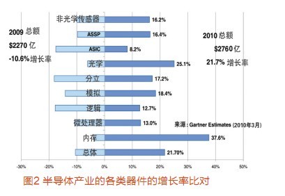 Gartner公司調(diào)查總監(jiān)Stephan Ohr從宏觀上分析了MEMS的增長態(tài)勢。Gartner把MEMS分為光學和非光學兩大類。光學MEMS如TI公司的DLP(數(shù)字投影芯片)。非光學MEMS傳感器年增長率16.2%(圖2),2010年市場容量會突破30億美元,有望達到31億美元;2009年為28億美元。其中,汽車應(yīng)用仍然保持非光學傳感器的第一位,占2009年總應(yīng)用中的60%以上;但是數(shù)據(jù)處理和通信應(yīng)用增長最快,數(shù)據(jù)處理包括硬盤的G-Force(重力)傳感器,通信中包括手機的可旋轉(zhuǎn)(rational)的傳感和基于位置的服務(wù)。