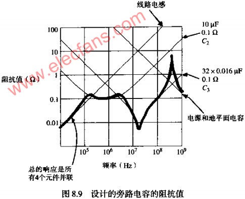 上式計算了圖8.9中電容C2和電容陣列C3的曲線。圖8.9中假設(shè)C2和C3電容陣列的每個元件的ESR都為0.1歐,總的電路板面積為10IN的2次方,電源的和地之間有0.01IN厚的FR-4電介質(zhì)。