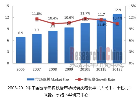 水清木華研究中心指出,近年來,在社會(huì)需求劇增、行業(yè)利潤豐厚以及醫(yī)改的背景下,中國醫(yī)學(xué)影像設(shè)備行業(yè)獲得高度發(fā)展。2006至2009年期間,行業(yè)市場規(guī)模從68.7億元人民幣增長至94.2億元人民幣,2006-2009年復(fù)合年增長率為10.9%,預(yù)計(jì)到2012年仍能保持10.4%的增長速度。