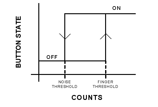 該轉(zhuǎn)移函數(shù)中的遲滯提供了開(kāi)關(guān)狀態(tài)之間的干凈利落的轉(zhuǎn)換,即使計(jì)數(shù)是有噪聲的情況下也不例外。這也為按鍵提供了一種反跳功能。低門限被稱為“噪聲門限”,而高門限則被稱為“手指門限”。門限水平的設(shè)定決定了系統(tǒng)的性能。當(dāng)覆蓋層非常厚時(shí),信噪比很低。在此類系統(tǒng)中設(shè)定門限水平是一項(xiàng)具有挑戰(zhàn)性的工作,而這恰好是電容式傳感設(shè)計(jì)技巧的一部分。