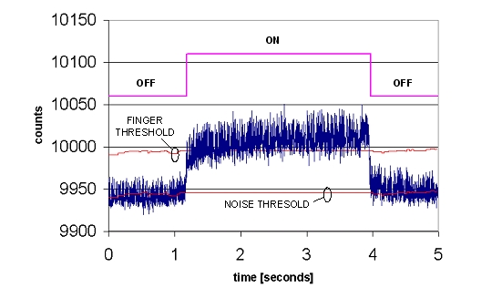 通過(guò)一個(gè)終端仿真程序,在主PC上獲得差分計(jì)數(shù),然后借助電子制表軟件加以繪制。將手指放置在10mm厚的玻璃覆蓋層上,并持續(xù)3秒的時(shí)間。按鍵的開(kāi)關(guān)狀態(tài)被疊加在原始計(jì)數(shù)上。按鍵在這兩種狀態(tài)之間干凈利落地轉(zhuǎn)換,即使是由于通過(guò)厚玻璃進(jìn)行檢測(cè)而使原始計(jì)數(shù)信號(hào)中具有較大的噪聲時(shí)也是如此。請(qǐng)注意手指和按鍵門限隨著基線的漂移而進(jìn)行周期性調(diào)整。當(dāng)檢測(cè)到手指的觸壓動(dòng)作時(shí),基線值將鎖定,直到手指移開(kāi)為止。