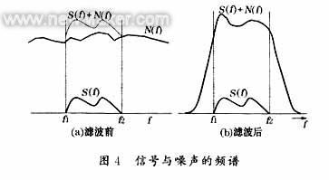 濾波電路的作用主要是對輸入信號進(jìn)行處理,通常是希望濾出噪聲。濾波器種類很多,從大的方向可分為經(jīng)典濾波器與現(xiàn)代濾波器兩大類。經(jīng)典濾波器可濾出與有用信號占用不同頻帶的噪聲,但對有用信號與噪聲的頻譜相互重疊的情況卻無能為力。圖4所示是信號與噪聲的頻譜,圖4中,S(f)為有用信號,頻帶為f1~f2,N(f)為噪聲,經(jīng)濾波后只能濾出f1~f2以外的噪聲,噪聲與信號重疊部分無法濾出。