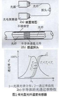 位圖2(a)為半導(dǎo)體吸光型(傳光型)光纖溫度傳感器示意圖。將一根切斷的光導(dǎo)纖維裝在細(xì)鋼管內(nèi),光纖兩端面間夾有一塊半導(dǎo)體感溫薄片(如GaAs或InP),這種半導(dǎo)體感溫薄片透射光強隨被測溫度而變化。因此,當(dāng)光纖一端輸入一恒定光強的光時,由于半導(dǎo)體感溫薄片透射能力隨溫度變化,光纖另一端接收元件所接受的光強也隨被測溫度而改變。于是通過測量光探測器輸出的電量,便能遙測到感溫探頭2(b)處的溫度。