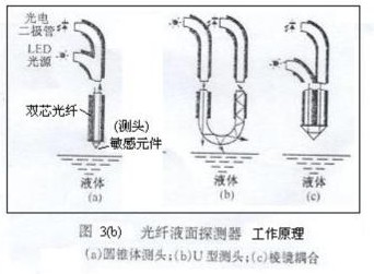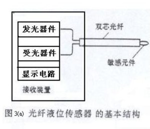 圖3(a)所示為光纖液位傳感器的基本結(jié)構(gòu)。這種傳感器的敏感元件和傳輸信號的光纖均由玻璃纖維構(gòu)成,故有絕緣性能好和抗電磁噪聲等優(yōu)點。