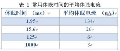 CY8C22x45系列芯片休眠時的工作電流僅有3uA[5],芯片內(nèi)包含一個休眠計數(shù)器,系統(tǒng)進入休眠后計數(shù)器開始遞減,當計數(shù)值為零時產(chǎn)生中斷喚醒系統(tǒng)。喚醒系統(tǒng)后可以不做任何處理再次進入休眠模式。這樣周而復始,達到所需要的整個休眠時間。在實際設(shè)計中,常常使用平均休眠電流替代公式2中的Isleep,即在每次休眠結(jié)束后,僅讓系統(tǒng)正常工作最短時間,該時間內(nèi)完成所有必須操作(僅是一次循環(huán)判斷),此時的電流即為該休眠時間下的平均休眠電流。表1列出了常用休眠時間的平均休眠電流。