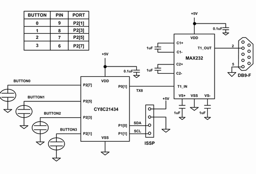 為了實現(xiàn)電容式傳感和串行通信,該電路采用了賽普拉斯的CY8C21x34系列中的PSoC IC芯片。該芯片包含一組模擬和數(shù)字功能塊,這些功能塊可由存儲于板上閃存中的固件來配置。另一顆芯片負(fù)責(zé)處理RS232的電平移位,以便建立到主機(jī)的通信鏈接,并實現(xiàn)波特率為115,200的電容式傳感數(shù)據(jù)記錄。四個電容傳感按鍵的引腳分配在圖5的表中給出。PSoC是通過一個包含電源、地以及編程引腳SCL和SDA的ISSP接頭來實現(xiàn)編程的。而通過一個DB9連接器將電腦與電容式傳感電路板相連。