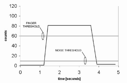 噪聲門限被設(shè)定的計數(shù)值為10,而手指門限設(shè)定的計數(shù)值則為60。實際上,在實際計數(shù)數(shù)據(jù)中噪聲分量是始終存在,圖中沒有顯示是為了能清晰地顯示門限水平。