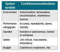 MEMS慣性傳感器可靠度高(汽車行業(yè)20年的應用歷史證明了這一點),它在手機和視頻游戲中的成功應用說明它在商業(yè)上極具吸引力。然而,不同應用對性能的要求大不相同,適合游戲的器件并不能解決本文所述的高性能導航問題。對于導航,重要的MEMS性能指標是偏置漂移、振動影響、靈敏度和噪聲。精密工業(yè)和醫(yī)療導航所需的性能水平通常比消費電子設備所用MEMS傳感器的性能水平高出一個數(shù)量級。表3列出了有助于傳感器選型的一般系統(tǒng)考慮。