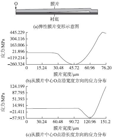 犧牲層厚度H2 < 1.6 μm 時(shí),隨著犧牲層厚度的減小,使膜片與襯底剛好接觸所加載的壓力也隨之減小,當(dāng)犧牲層厚度減小使該加載壓力減小到剛好滿量程壓力時(shí),犧牲層厚度不可再減小,否則傳感器在量程范圍內(nèi)將出現(xiàn)了非線性形變,這樣便確定了減小犧牲層厚度提高過(guò)載能力的極限值。經(jīng)過(guò)仿真,膜片長(zhǎng)度a = 300 μm、寬度b = 150 μm、膜片厚度H1 = 3 μm 時(shí),對(duì)應(yīng)的犧牲層厚度最小值為0.3μm。下面利用有限元分析軟件對(duì)此參數(shù)的壓力傳感器進(jìn)行非線性接觸分析。按照模型建立、網(wǎng)格劃分、接觸對(duì)建立、加載、求解的順序進(jìn)行模擬仿真。當(dāng)最大應(yīng)力達(dá)到硅的斷裂強(qiáng)度時(shí),加載壓力為1.55MPa,仿真結(jié)果如圖4 所示,其中點(diǎn)O 處于膜片中心。