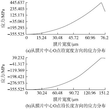 本文以量程0.1 MPa 的犧牲層結(jié)構(gòu)壓力傳感器為例,設(shè)計(jì)出電壓源E =5 V 時(shí),滿量程輸出為60 mV的壓力芯片。為了滿足靈敏度的設(shè)計(jì)要求,改變彈性膜片的寬度、長(zhǎng)度、厚度和犧牲層厚度對(duì)應(yīng)力分布進(jìn)行模擬仿真( 模擬仿真時(shí)多晶硅楊氏模量EX = 1.7 ×1011 N/m2,泊松比PRXY =0.24,多晶硅納米薄膜應(yīng)變因子G =30) ,經(jīng)過(guò)優(yōu)化后,得到滿足設(shè)計(jì)要求的彈性膜片尺寸: 長(zhǎng)度a = 300 μm、寬度b = 150 μm、膜片厚度H1 =3 μm、犧牲層厚度H2 =3.5 μm。