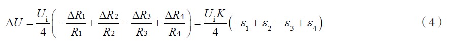 對(duì)于全等臂電橋, R1= R2= R3= R,各橋臂電阻應(yīng)變片靈敏系數(shù)K相同,式(2)可簡化為
