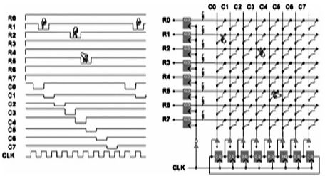 如圖8 所示,8×8 數(shù)字電阻觸摸屏, 基于Altera 解決方案[1]:它采用兩層ITO 分別作為水平的sensing line(觸摸感測線)和垂直的driving line(加電驅(qū)動線),driving line 和sensing line 之間的觸點就相當(dāng)于一個開關(guān),在未接觸時,它們之間是絕緣的,而接觸發(fā)生后,兩者發(fā)生短路,相當(dāng)于開關(guān)閉合。驅(qū)動的時候,其中sensing line 通常由一個上拉電阻施加高電平,同時在driving line 上以一定頻率依次在各列中施加負(fù)脈沖電壓,這樣當(dāng)掃描到觸點所在的那一列時,由于觸點開關(guān)閉合,形成直流通路,使得觸點所在行的電壓被拉低,形成一個負(fù)脈沖,這樣就檢測到了觸點的位置。由于driving line 是依次掃描,所以可以檢測到多個觸點的位置。