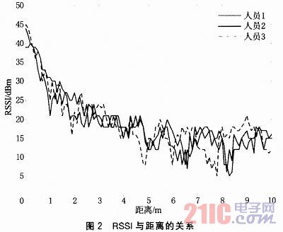 3個工作人員分別拿著移動終端在0~10 m的范圍內勻速前進,得到的RSSI值與距離的關系如圖2所示。