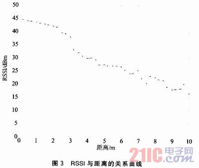 在相同的實驗平臺下,在0~10 m的范圍內,每間隔0.2 m或者0.3 m記錄RSSI值,每個距離均接收100個左右的數(shù)據(jù)包,對RSSI先進行均值處理,然后得出RSSI值與距離的關系曲線如圖3所示。