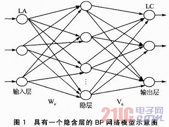 BP網(wǎng)絡是神經(jīng)網(wǎng)絡中采用誤差反傳算法作為其學習算法的前饋網(wǎng)絡,通常由輸入層、輸出層和隱含層(一層或多層)構成。層與層之間的神經(jīng)元采用全互連的連接方式,通過相應的網(wǎng)絡權系數(shù)w相互聯(lián)系,每層內的神經(jīng)元之間沒有連接。圖1所示為具有一個隱含層的BP網(wǎng)絡模型。其中:LA為BP神經(jīng)網(wǎng)絡的輸入層,LB為隱層,LC為輸出層,Wir為隱層與輸入層的權值,Vrj為輸出層與隱層的權值。