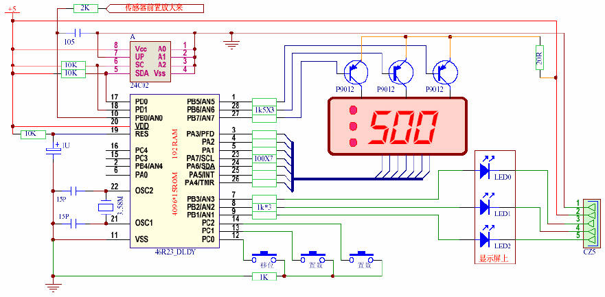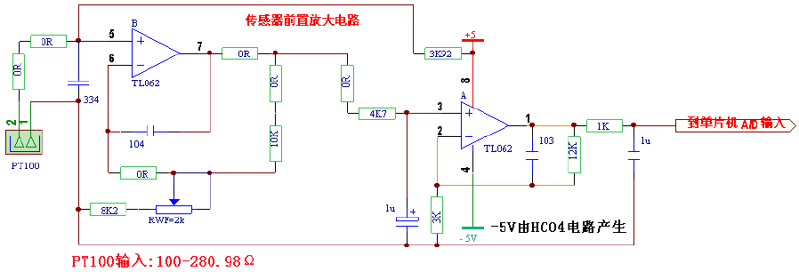傳感器的接入非常簡(jiǎn)單,從系統(tǒng)的 5V 供電端僅僅通過(guò)一支 3K92 的電阻就連接到 PT100 了.這種接法通常會(huì)引起嚴(yán)重的非線性問(wèn)題,但是.由于有了單片機(jī)的軟件校正作為后盾,因此就簡(jiǎn)化了傳感器的接入方式.