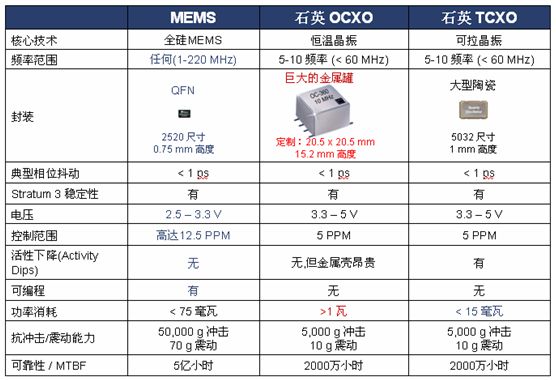 圖4:MEMS三級(jí)鐘和傳統(tǒng)OCXO和TCXO三級(jí)鐘的比較