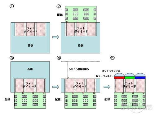 背照式CMOS傳感器的具體結(jié)構(gòu)如上圖所示(源自索尼資料,其他芯片廠家的產(chǎn)品可能在細(xì)節(jié)上有不同,但大體意思是相同的),橙色的為光線路,黃色線為受光面。左邊的傳統(tǒng)式,明顯看到光線通過(guò)微透鏡后還需要經(jīng)過(guò)電路層才能到達(dá)受光面,中途光線必然會(huì)遭到部分損失(包括被阻擋或被減弱)。背照式CMOS傳感器的元件則不同,在改變了結(jié)構(gòu)后,光線通過(guò)微透鏡后就可以直接到達(dá)感光層的背面,完成光電反應(yīng),從進(jìn)光量上改善了感光過(guò)程。