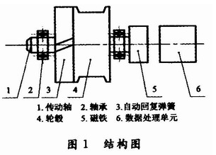 基于磁敏角度技術(shù)的拉線式位移傳感器的功能是將拉線的機械位移換成可以計量、記錄或傳送的電信號,主要由自動回復(fù)彈簧、輪轂、磁鐵以及數(shù)據(jù)處理單元等部分構(gòu)成,結(jié)構(gòu)如圖1所示。