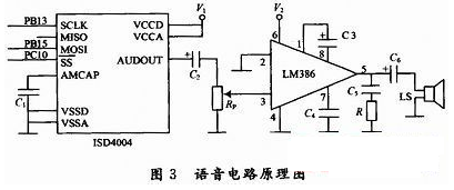 語音電路原理圖如圖3所示,由美國ISD公司的語音芯片ISD4004-16和美國國家半導(dǎo)體公司的音頻功率放大器LM386等元件構(gòu)成。ISD4004 -16錄放時間為16 min(可分段),它采用CMOS技術(shù),單電源3 V工作,內(nèi)含振蕩器、抗混疊濾波器、平滑濾波器、音頻放大器、自動靜噪及高密度多電平閃爍存貯陳列。它內(nèi)置微控制器SPI總線串行通信接口??蓪⒛M語音數(shù)據(jù)直接寫入單個存儲單元,不需通過A/D或D/A轉(zhuǎn)換。使得ISD語音電路具有音質(zhì)自然、使用方便、單片存儲、反復(fù)錄放、低功耗、抗斷電等許多優(yōu)點。LM386工作電壓范圍寬,電壓增益可調(diào)。具有自身功耗低、電壓增益可調(diào)整電源電壓范圍大、外接元件少和總諧波失真小等特點。本設(shè)計中STM32F103VC通過SPI2給ISD4004傳送語音信息。圖3中的V1和V2分別經(jīng)三極管與+3.3 V和+12 V電源相連,三極管的通斷由STM32F103VC的PCI1和PCI2控制,只有在需要語音提示時,才使三極管導(dǎo)通給ISD4004和LM386供電。