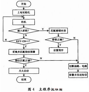 在鎖定狀態(tài),車主要進行指紋注冊/刪除或應(yīng)急點火時,接入密碼鑰匙,通過鍵盤操作STM32F103VC在其PA1產(chǎn)生CH376T芯片的SPI片選信號,低電平有效,然后按SPI輸出方式發(fā)出一個字節(jié)的數(shù)據(jù),延時1.5μs,從CH376T接收一個字節(jié)的數(shù)據(jù),等待SPI接口空閑后,MCU繼續(xù)從CH376T接收數(shù)據(jù),直到MCU禁止SPI片選。接下來對讀取的數(shù)據(jù)進行密碼匹配,密碼匹配正確時可進入設(shè)置狀態(tài),車主可根據(jù)語音和LCD提示進行操作,操作結(jié)束便返回鎖定狀態(tài)。如果密碼匹配不正確將發(fā)出相應(yīng)報警信號并切斷電路和油路。如果不進行設(shè)置,當(dāng)插入汽車鑰匙并打至“ON”位,可進行指紋采集和匹配,匹配正確可自動點火(點火失敗時可用車鑰匙再次點火),如果指紋匹配不正確,發(fā)出相應(yīng)報警并保持電路和油路為斷開狀態(tài)。