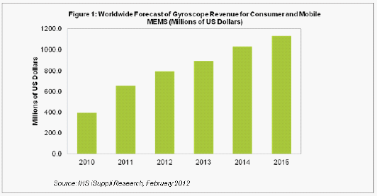 據(jù)IHS iSuppli公司的MEMS市場追蹤報(bào)告,由于蘋果iPhone和iPad去年第四季度創(chuàng)出最高銷量紀(jì)錄,2011年陀螺儀成為消費(fèi)與移動MEMS領(lǐng)域中的創(chuàng)收大戶。