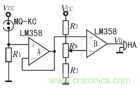 圖l中,R1是傳感器要求的負(fù)載電阻,阻值為120 Ω,Vcc為9 V電源電壓;A、B為LM358雙運放,A為跟隨器,起緩沖隔離作用,以便將R1上的電壓VR1基本上全部施加到比較器B的同相輸入端。RW為報警靈敏度調(diào)整電位器。穩(wěn)態(tài)時,調(diào)整RW使得加到比較器反相輸入端的電壓V-略高于穩(wěn)態(tài)時R1上的電壓VR1這個電壓越高,報警靈敏度就越低。加電并使傳感器達到穩(wěn)態(tài)后,MQ-KC為較穩(wěn)定的固定阻值,當(dāng)Vcc不變時,VR1基本為一固定值,保持不變。當(dāng)有可燃性氣體泄露時,傳感器接觸到可燃?xì)?,使其電?dǎo)率上升,電阻下降,使VR1上升,當(dāng)VR1高于V-時,比較器輸出一個大于7 V的電壓,從而使蜂鳴器HA發(fā)出滴、滴的報警聲。若用該電壓控制一個繼電器,即可實現(xiàn)控制功能。為了提高抗干擾能力,可分別在R1和B的V-端并聯(lián)一只濾波電容。