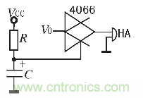 圖1所示的基本報警電路的不足:一開始加電時,傳感器尚未達到穩(wěn)態(tài),其電阻值較小,VR1較大,導(dǎo)致蜂鳴器HA誤報警。為了解決這一問題,采用一個數(shù)字信號控制的模擬開關(guān),其控制信號采用簡單的電容充電延時電路,原理圖如圖2所示。圖1中比較器B的輸出V0加到模擬開關(guān)4066的輸入端,開關(guān)的輸出端接蜂鳴器HA。初始加電時,電容C上的電壓VC為0,4066不導(dǎo)通,無論V0值為多高,HA都不會報警。隨著電容充電,VC不斷升高,當(dāng)達到4066的控制門限閾值時,4066才導(dǎo)通,即能進入報警狀態(tài)。電容充電使其電壓達到4066的控制門限閾值時間即為延時時間。電容C和電阻R的取值可根據(jù)延時要求確定。為可靠起見,取RC=1/2T,T為傳感器初始穩(wěn)定時間。本裝置取R=l MΩ,C=100μF,即能實現(xiàn)可靠的延時。