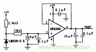 MEMS傾角傳感器SCA100T在傾角為0°時,模擬輸出為其電源電壓的1/2倍,如果傾角傳感器電源電壓有波動,則其輸出會產(chǎn)生相應(yīng)的波 動。因此設(shè)計時,將給模數(shù)轉(zhuǎn)換電路提供基準(zhǔn)源的輸出(如圖4所示),經(jīng)過提高驅(qū)動能力后,提供給MEMS傾角傳感器SCA100T作電源(如圖5所示)。 一方面,基準(zhǔn)源輸出紋波極小,且性能穩(wěn)定;另一方面,模數(shù)轉(zhuǎn)換器的基準(zhǔn)源和MEMS傾角傳感器SCA100T的電源同時向相同方向變化,抵消了MEMS傾 角傳感器因電源引起零點漂移的影響。