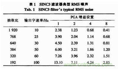 C8051F350內(nèi)部有具有2個獨立的抽取濾波器(SINC3濾波器和快速濾波器)和1個可編程增益放大器。根據(jù)參考文獻SINC3濾波器RMS噪聲小,精度高,缺點是輸出速率較低,而快速濾波器則相反。本設(shè)計對速率要求低,而對精度要求高,因此選用SINC3濾波器。SINC3濾波器典型RMS噪聲如表1所示。