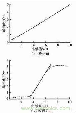 經(jīng)Matlab計算普通半橋在3~7 mH段,電壓變化范圍1.5~3.5 V,電壓對電感的靈敏度為0.5V/mH。線性度近似為1。對圖3(b)采用最小二乘法擬合直線后,在3.8~6.3 mH段,輸出電壓的變化范圍0.77~4.39 V。線性度可達(dá)2.39%,靈敏度為1.448 V/mH。