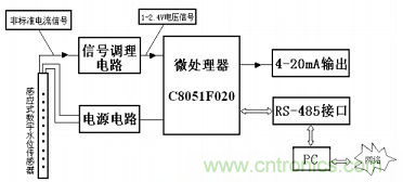 該系統(tǒng)的主要結(jié)構(gòu)框圖如圖1所示,主要由感應(yīng)式數(shù)字水位傳感器、信號調(diào)理電路、電源電路、MCU最小系統(tǒng)、4~20 mA輸出(AD421)、RS-485接口(MAX485),另外還包括PC,通過PC上位機監(jiān)控軟件實現(xiàn)網(wǎng)絡(luò)通信功能。
