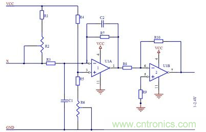 信號調(diào)理電路中還設(shè)計濾波電路,是為了濾去測量現(xiàn)場的干擾,例如電氣干擾、電磁干擾,使系統(tǒng)的信噪比增加。如圖2所示,電阻R2和電容C1組成簡單的無源RC低通濾波器。電阻R3、R7,電容C2及運放組成一階反相輸入RC有源低通濾波器,有源濾波器比無源濾波器具有更優(yōu)越的性能,提高了頻率特性值,改善了選擇性。
