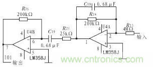 0.7 Hz的高通濾波器用來檢測心跳信號,這里采用2個二階壓控高通濾波器串聯(lián)形成的四階高通濾波器來構成O.7Hz高通濾波器,其電路如圖6所示。