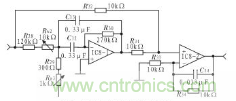 該低通濾波電路主要濾除干擾信號,并且要求幅頻特性中有最大的平坦區(qū),為此選用四階壓控電壓源巴特沃斯But-terworth型濾波器。壓控電壓源型電 路結構的濾波器特點是使用元件少,對放大器要求不高。在本級電路中,電阻器誤差小于0.01%,電容器誤差小于O.1%。由于電路中所選電阻值不在電阻序 列之內,故實際電路中,用多個電阻串聯(lián)以求得到所需的阻值,電路中電容必須經過嚴格挑選。電路原理如圖5所示。10 Hz,0.6 Hz四階Butterworth LPF電路的元件值如表1所示。
