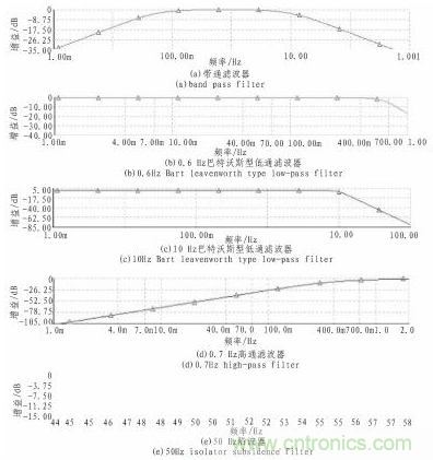 根據(jù)前面的設計電路,對0.05~1O Hz帶通濾波器、10 Hz和0.6 Hz的低通濾波器、0.7 Hz的高通濾波器及50 Hz的陷波器電路中各元件進行估值并通過MulTIsim仿真且反復調試,并通過電路試驗,獲得了較為理想的幅頻特性,各部分電路的幅頻特性測試結果如圖 8所示。從圖8中可以看出,0.05~1O Hz帶通濾波器、10 Hz和0.6 Hz低通濾波器、0.7 Hz的高通濾波器都具有平坦的3 dB通頻帶,50 Hz陷波器的Q值大于5。