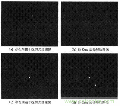 圖4為拍攝到太陽光斑存在干擾時(shí)的圖像,對比圖4(a)和圖4(b)可發(fā)現(xiàn)用Otsu法分割處理后,能有效消除圖像中細(xì)微干擾。圖4(c)由Otsu法處理后得到圖4(d),光斑圖像坐標(biāo)(160,120),光斑個(gè)數(shù)為2,對應(yīng)FYP和FWP為O。由此判斷拍攝的圖像存在明顯干擾,程序?qū)YP和FWP置為O,確保系統(tǒng)的可靠性。