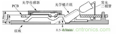 圖1為鼠標芯片的安裝裝配圖。因OM02芯片為COMS型傳感器,因此必須配備有與之相適應的高強度發(fā)光二極管,發(fā)射角度與底板夾角30。~45。 范圍內(nèi)。在標準安裝配合后,底板距離工作表面的有效距離在0mm~2mm內(nèi),OM02芯片可進行正常的數(shù)據(jù)接收檢測。