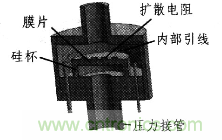 所設(shè)計(jì)的壓阻式壓力微傳感器,其制法是將N型硅腐蝕成厚10~25μm的膜片,并在一面擴(kuò)散了4個(gè)阻值相等的P型電阻。硅膜片周邊用硅杯固定,則當(dāng)膜片兩面有壓力差時(shí),膜片即發(fā)生變形,從而導(dǎo)致電阻變化。用微電路檢測出這種電阻變化,通過計(jì)算即可得出壓力變化如圖2所示。