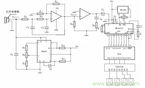 按照上述設(shè)計原理,設(shè)計的二氧化碳檢測電路如圖3所示。工作原理是首先由紅外傳感器將探測到二氧化碳?xì)怏w的濃度并轉(zhuǎn)換成電信號,濾波電路提取電信號并輸出到放大電路,經(jīng)過單片機(jī)系統(tǒng)處理后輸出,再由74AC138送入顯示電路,以實現(xiàn)對二氧化碳?xì)怏w濃度的檢測。