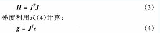 式中,J為Jacobian矩陣,包括網(wǎng)絡誤差項相對于權重和閾值的一階微分 ,e為網(wǎng)絡的誤差項。Jacobian矩陣可以利用標準的BP算法得出,這比直 接計算Hessian矩陣簡單得多。迭代式為: