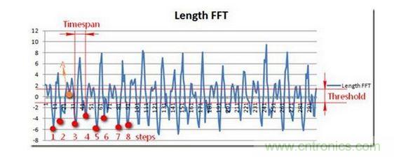 人體最快的跑步頻率為5HZ,也就是說相鄰兩步的時間間隔的至少大于0.2秒,如圖所示,我們設(shè)置了timespan在記步過程中我們過濾了高頻噪聲,即步頻過快的情況。同時我們通過和上次加速度大小進(jìn)行比較,設(shè)置設(shè)立一定的閥值Threshold來判斷運(yùn)動是否屬于有效,有效運(yùn)動才可進(jìn)行記步。