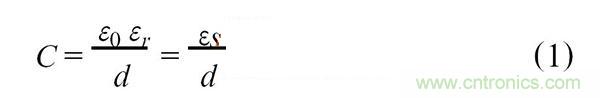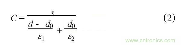 式中,S為極板相互遮蓋面積,單位為m2;d為兩平行板間的距離,單位為m;ε為極板間介質(zhì)的介電常數(shù);εr極板間介質(zhì)的相對介電常數(shù);ε0真空的介電常數(shù)。從上式可以看出,當d小時可使電容量增大,而使靈敏度增加,但d過小容易引起電容器擊穿,一般我們可以采取在極板間放置云母來改善,此時電容C為兩電容串聯(lián),可寫成: