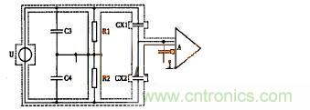 第三個問題是分布電容的影響。由于電容傳感器一個很關(guān)鍵的問題是分布電容電容量與傳感器電容量相比不僅不能忽略,而且影響還極其嚴重,其后果是造成傳輸效率降低、靈敏度下降、測量誤差增加及穩(wěn)定性變差。近幾年來,對此問題有了新的解決途徑。其中“整體屏蔽法”就是一例,以差動電容傳感器為例,說明整體屏蔽法,在下圖中,CX1、CX2為差動電容,U為電源,A為放大器,整體屏蔽法是把整個電橋(包含電源電纜等)一起屏蔽起來,設計的關(guān)鍵點在于接地點的合理設置。采用把接地點放在兩個平衡電阻R1、R2之間與整體屏蔽共地,這樣,傳感器公用極板與屏蔽之間的分布電容C1與放大器的輸入阻抗并聯(lián),從而可把C1視作放大器的輸入電容。由于放大器的輸入阻抗有極大值,C1的并聯(lián)也不希望存在,但它只影響靈敏度而已,另外兩個分布電容C3、C4并聯(lián)在橋臂R1、R2上,會影響電橋的初始平衡和整體靈敏度,并不影響電橋的正常工作。因此,分布參數(shù)對傳感器電容的影響基本消除,整體屏蔽法是解決電容傳感器分布電容問題的很好方法,缺點是使結(jié)構(gòu)復雜。